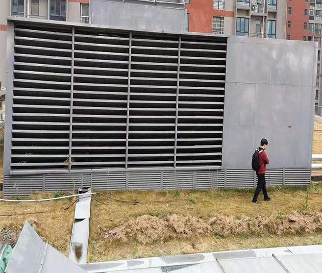3、進氣消聲。空調外機進氣也是降噪的重點之一。由于空調機組設備較大,排氣量與進氣量都是非常巨大的,但是空調設備的壓縮機產生的噪聲值也是非常的高,既要保證降噪效果又要保證進氣,所以使用進氣斜插式消聲百葉和進氣企口。