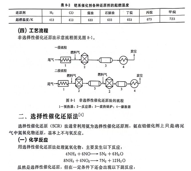 含NOx的氣體,在一定溫度和催化劑的作用下,與還原劑發生反應,其中的二氧化氮還原為氮氣,同時還原劑與氣體中的氧發生反應生成水和二氧化碳。還原劑有氫、甲烷、一氧化碳和低烴類化合物。在工業上可選用合成氨釋放氣、焦爐氣、天然氣、煉油廠尾氣和氣化石腦油等作為還原劑。一般將這些氣體統稱為燃料氣。