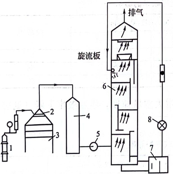 1-液氨鋼瓶;2-氨分布器;3一通風(fēng)柜;4-緩沖瓶;5-風(fēng)機(jī);6-吸收塔;7一堿液循環(huán)槽;8-堿泵